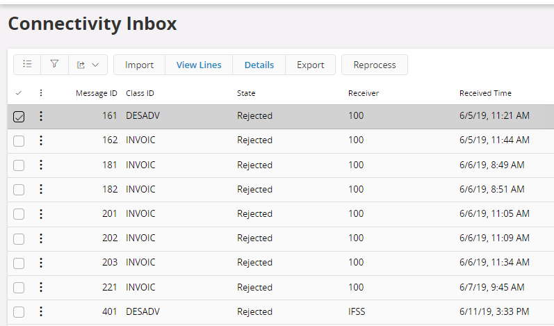 - PartlyAccepted - Some lines of the message have some errors and the others processed without an error. User can ReProcess the rejected message lines.