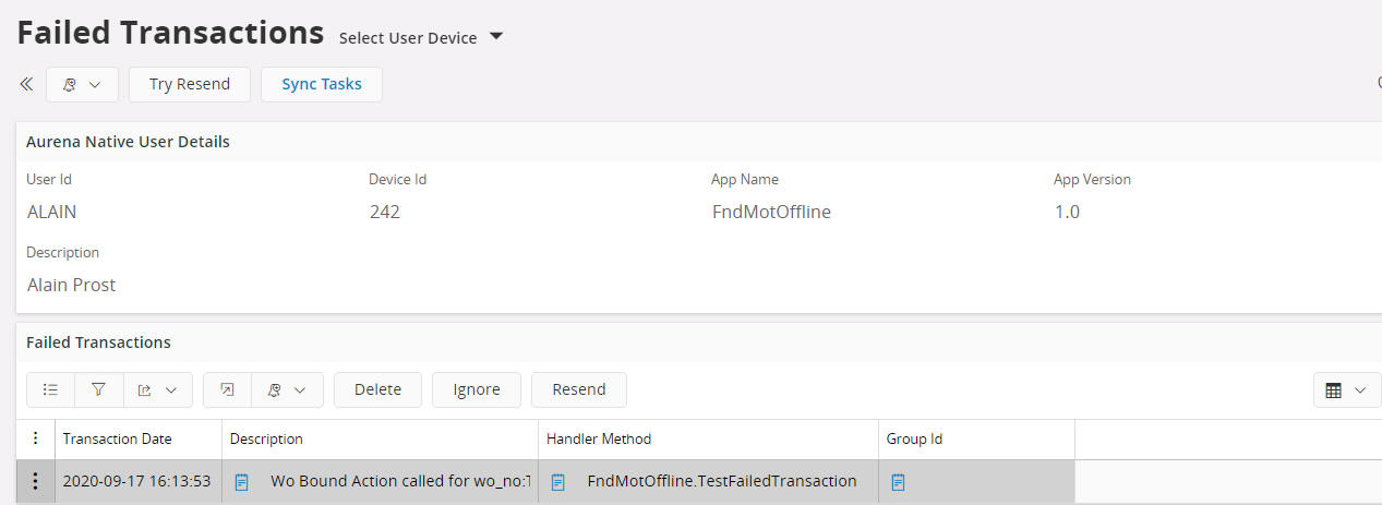 This will attempt to reprocess the transaction queue and will use the data displayed in the Failed Transaction Details screen. The transaction will be reprocessed as the mobile app user to ensure a full audit trail of the mobile app users transactions.