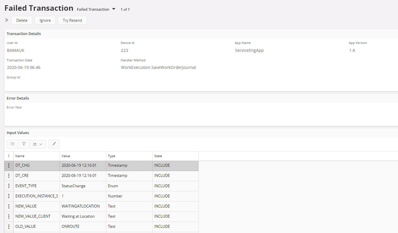 Note: The Transaction Group can have a negative number. This is due to the mobile app setting a key sequence number with a negative number which will be replaced with an IFS Cloud generated sequence number on successfully processing. The mobile client framework ensures the automatic replacement of mobile app generated keys with IFS Cloud generated keys.