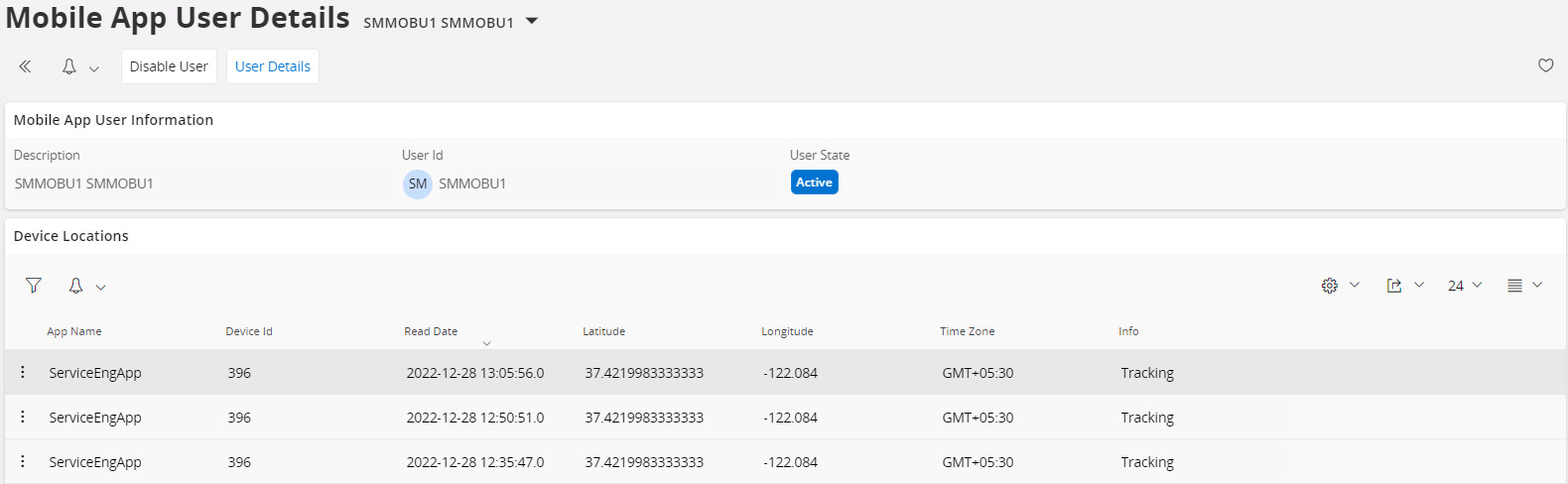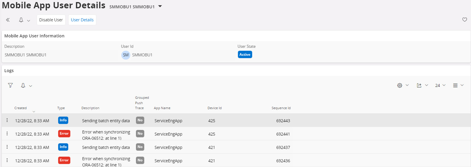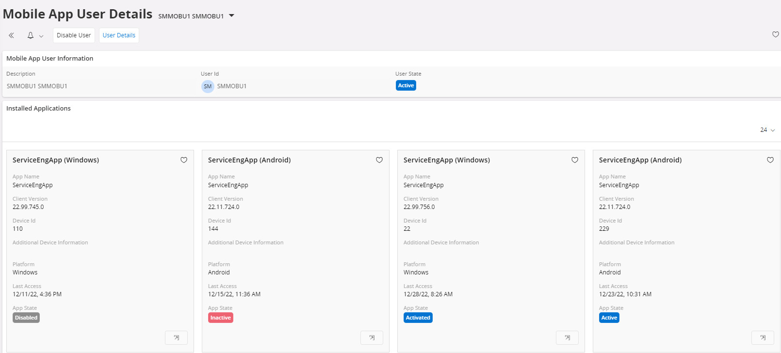 Mobile App User Details displays the User ID, Description and State of the mobile app users that have connected to an IFS app from a mobile app.