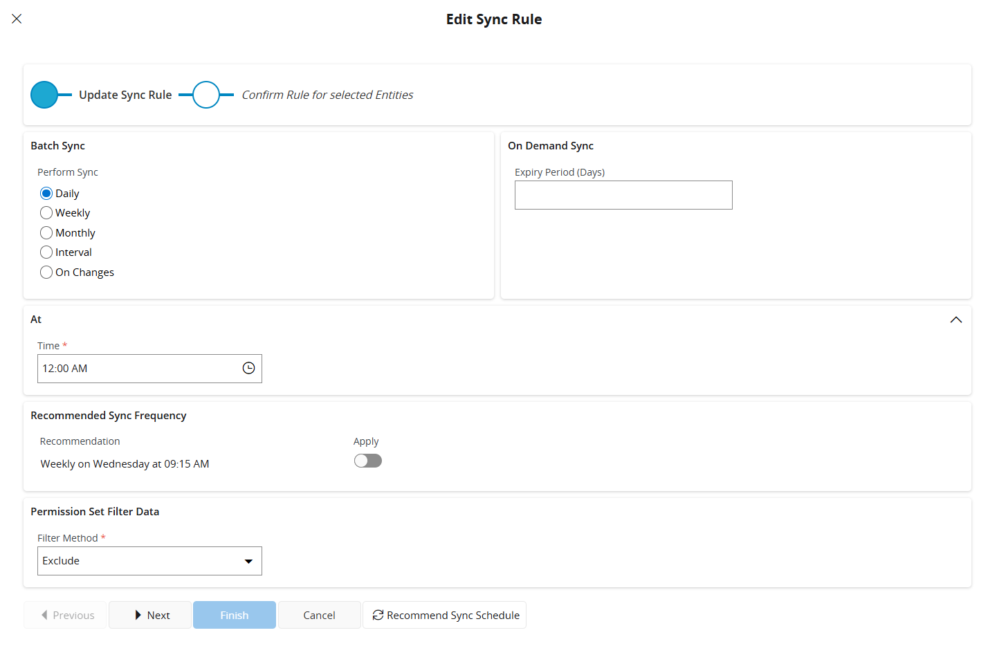 For batch entities, clicking the Recommended Sync Schedule button reveals a rule-based recommendation, based on the historical data to determine the optimal sync frequency. To apply this generated recommendation, simply enable the Apply toggle, which will automatically update the current sync schedule with the recommended frequency.