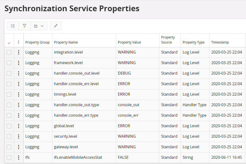 For IFS Cloud Mobile Server there is currently only one Ifs property, ifs.enableMobileAccessStat, which is used to measure performance. It is a string value and when it is TRUE the logging is on. Any other value will be treated as if the logging is off. Logs will be created when Ifs Property has the Value TRUE and the logs can be seen in the screen Synchronization Service Stat Records.