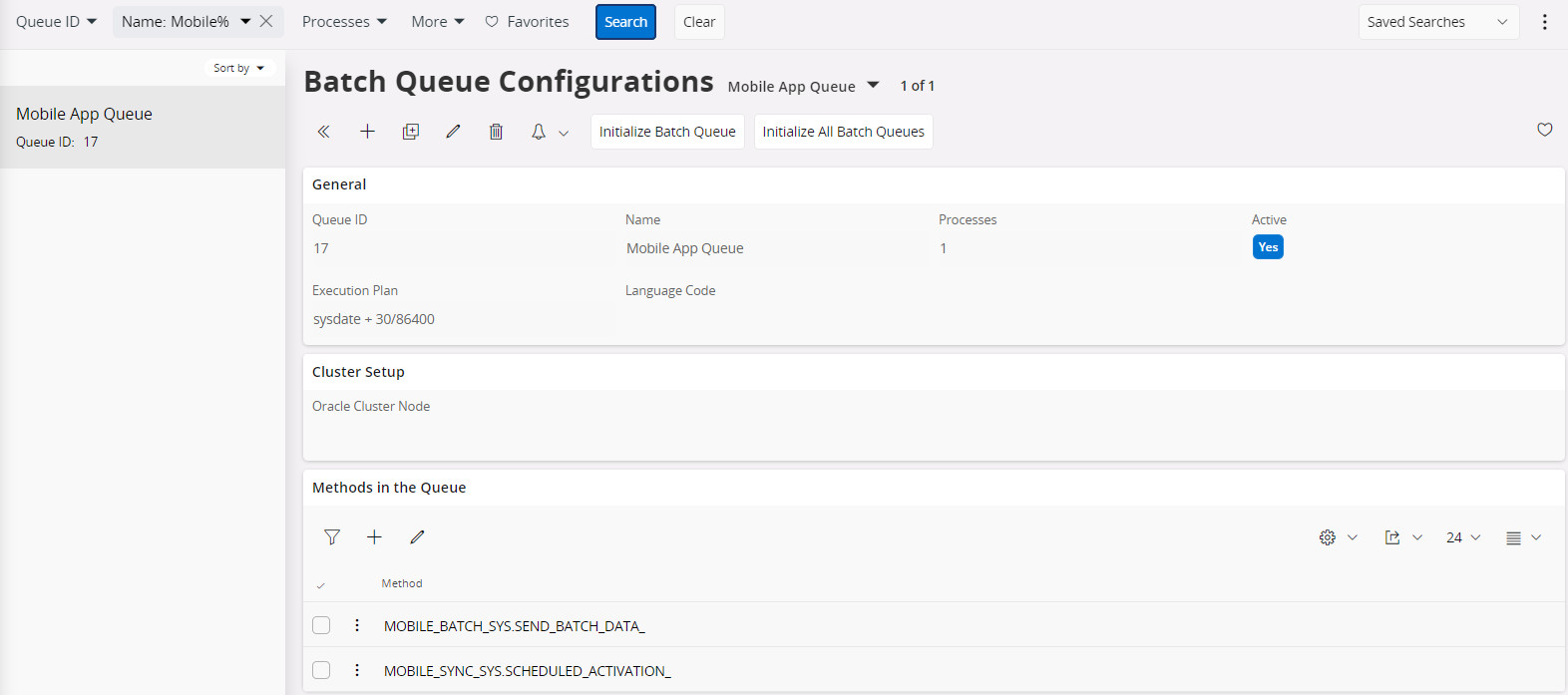 The Mobile App Queue handles the Batch Synchronization and Scheduled Activation. The number of processes that are allocated to this Queue will affect the number of Background Jobs that are created when processing Synchronization Tasks.