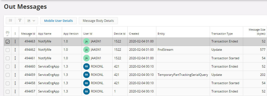 Out Messages records are created per User/Device/Application. Each record holds the actual data to be synchronized and shows the entity that will be affected and the transaction type indicates the execution which will take place.