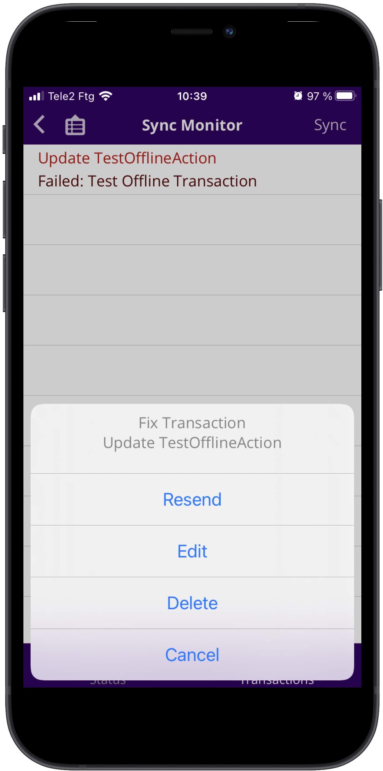 Options exist in the mobile app to Resend, Edit or Delete the failed transaction as shown below: