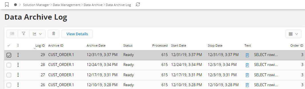 Status | Can have the values Executing, Ready and Error. Executing means that the data archive process has started and not finished. If a fatal error has occurred the status will remain in Executing and an error message is written in the database alert log. Ready means that the data archive process is finished. Error means that the data archive process is finished with error. |