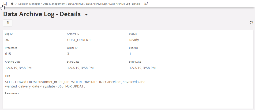 Parameters | The data archive order execution parameters and their values, if parameters exist. This is an IFS message string. |