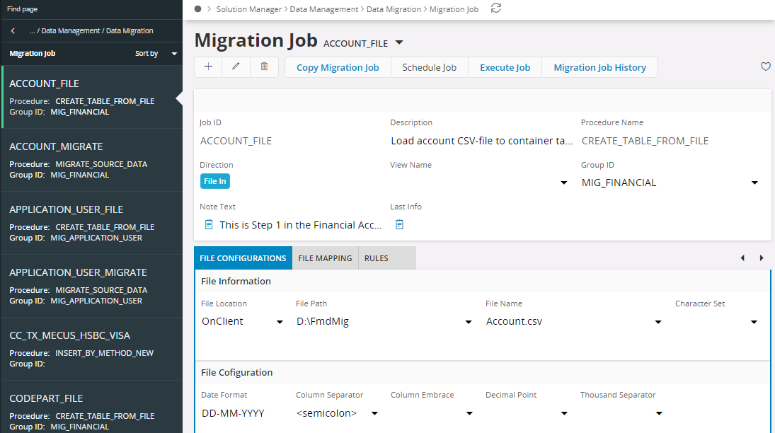 Go to Solution Manager > Data Management > Data Migration > Migration Job form. Here you have a header with details common to all types of migrations and child tabs that enables according to the selected Procedure (Migration type).