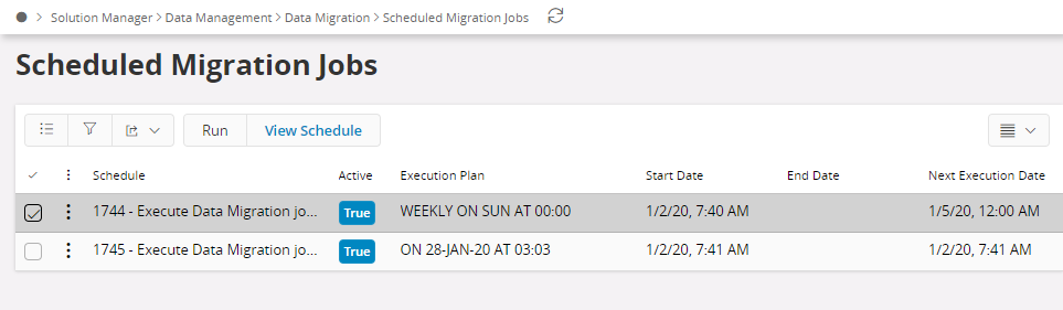 In scheduled Migration Jobs form, Run button will execute the schedule job if want to execute it at present. Use View Schedule job to navigate to the Background task for more details.