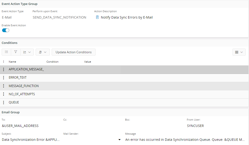 - Create a Even action for Event 'SEND_DATA_SYNC_NOTIFICATION'