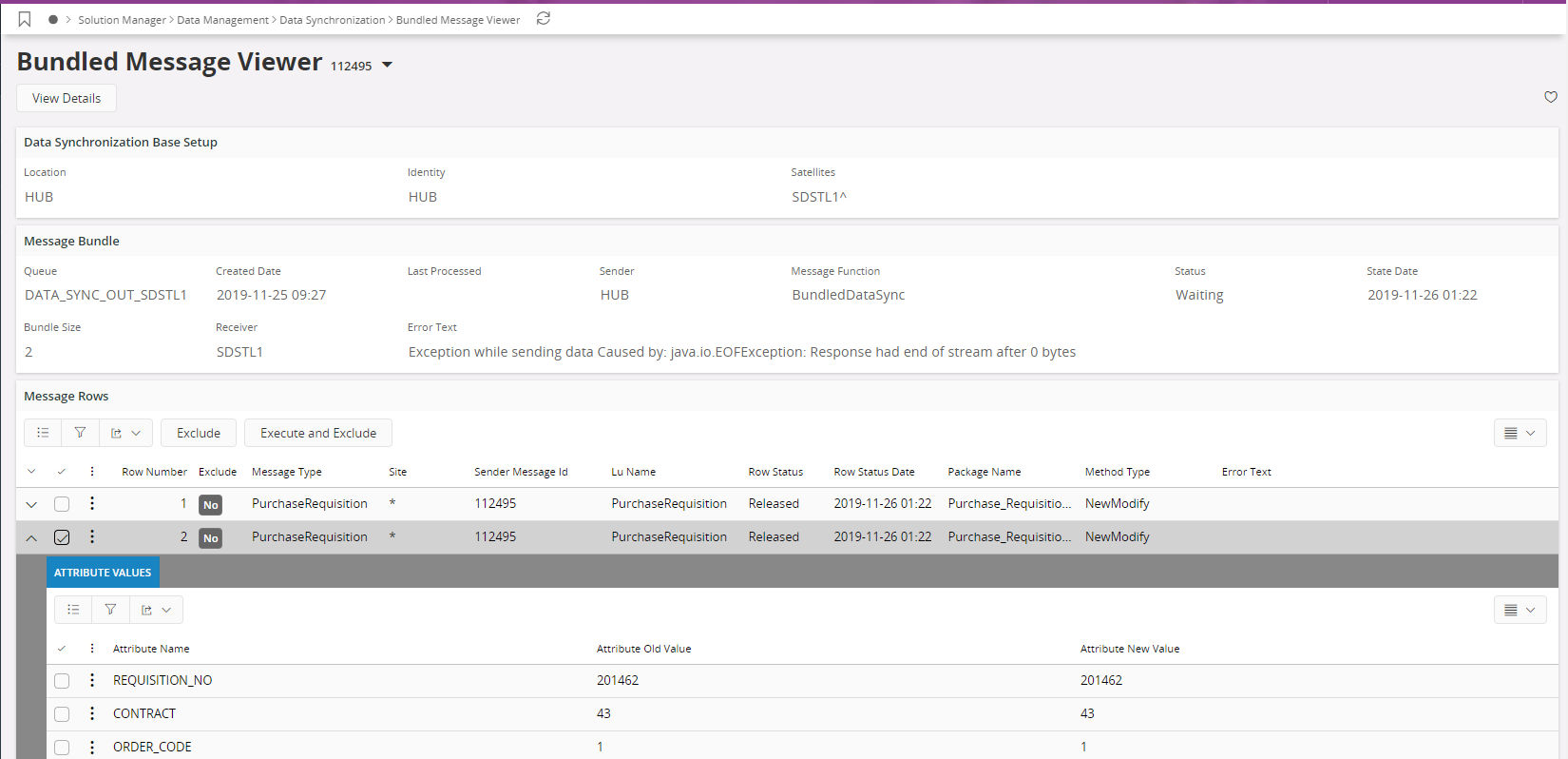 The new attribute string and the old attribute string of the synchronization message is also visible here. They can be used to identify the reason for a message failure.