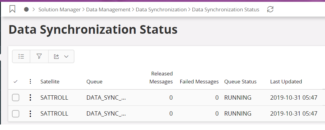 Data synchronization monitoring is supported by the framework by collecting and presenting synchronization message queue status of each environment. Message status of each individual satellite installation is collected and sent to Hub installation periodically by using a specific database task called Forward Data Synchronization Statistics.