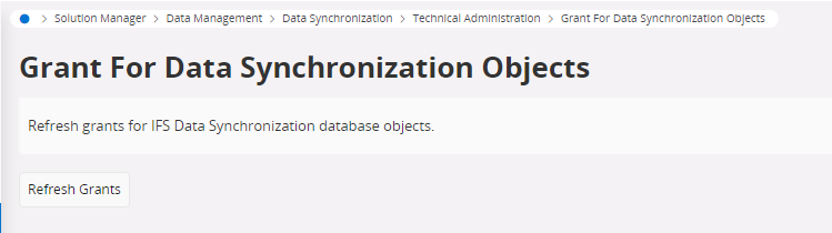 IFS Data Synchronization customer operations sometimes require access to database tables to do data repairs. This happens mostly due to specific customer requirements rather than issues with IFS framework. IFS recommendation is to avoid this situation in all possible ways. However, in such situations, database table access is granted to data synchronization specific database user. Database tables are granted only if the LUs are enabled for data synchronization. Following page gives user the possibility to refresh grants when required. IFS recommends that a user with proper authorization should execute this action, since this is not a regular end user activity.