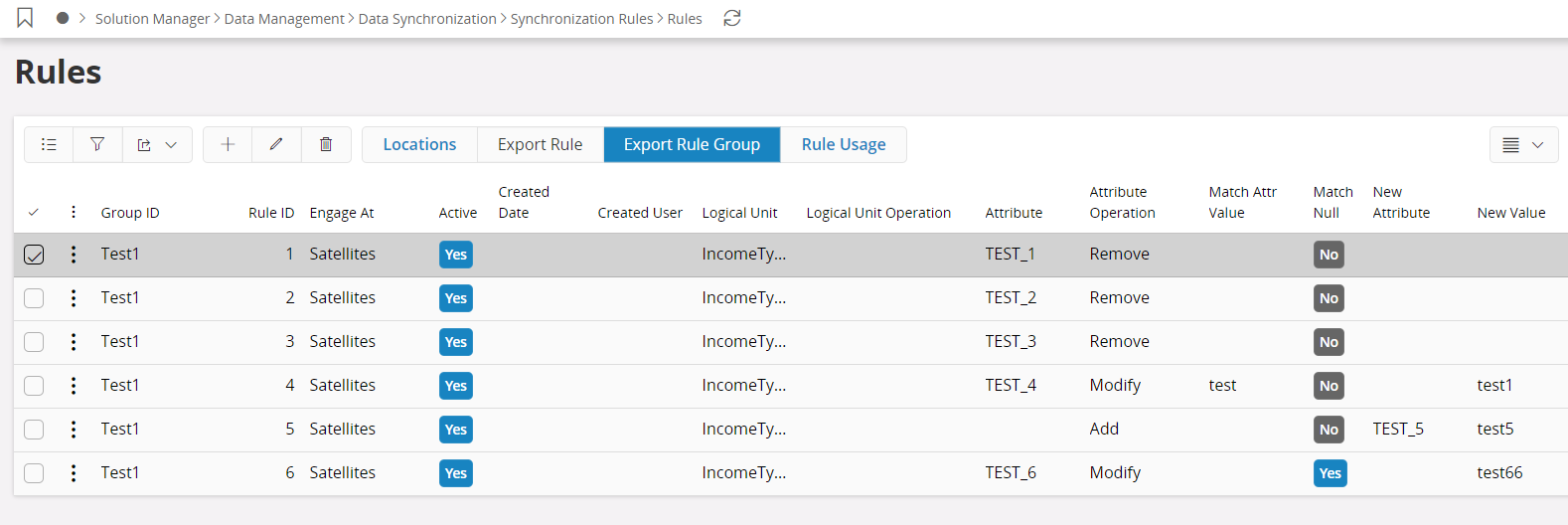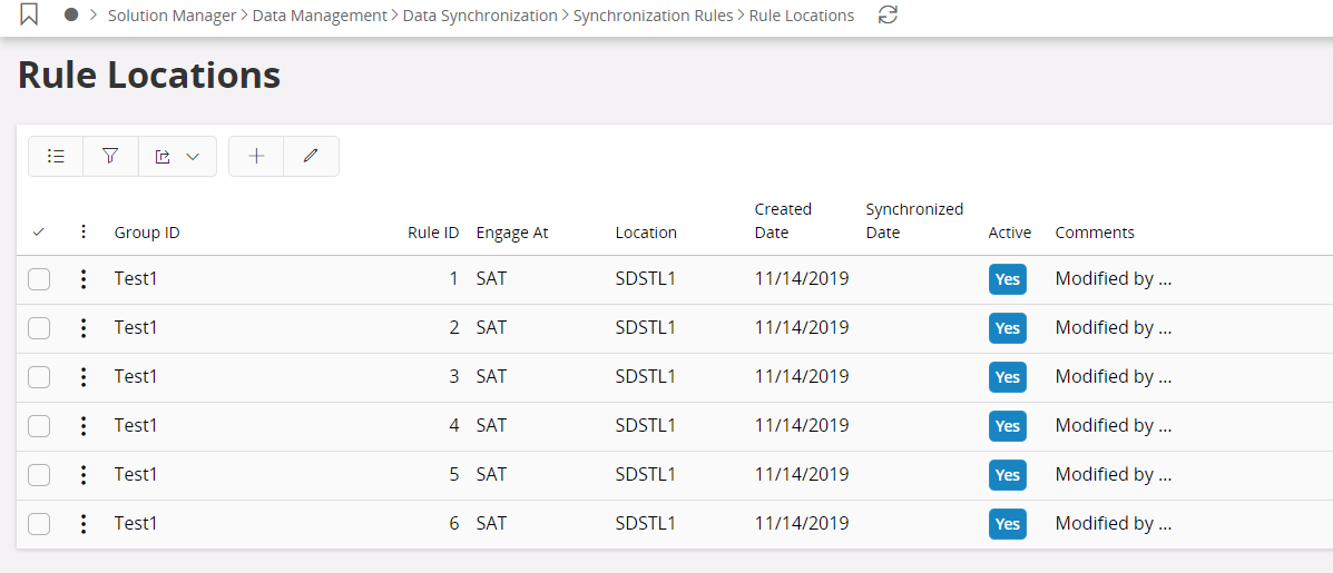 Rule Location describes each rule and the sites which it is used. When a Synchronization Rule is created, Rule Location entries are created automatically by the system. Created by system comment is automatically applied when the system creates the entries for every Satellite site registered with the system. It is possible to deactivate the rule for a single satellite using the Active option button. When a patch is applied, an exported Synchronization Rule script is applied with it. Refer Rule Engine Process Flow for more details. Once the script is applied, if the Synchronization Rule is available in the site then it will be automatically disabled by the script. Modified by Script comment is added and the Synchronized Date is updated automatically once that happened.