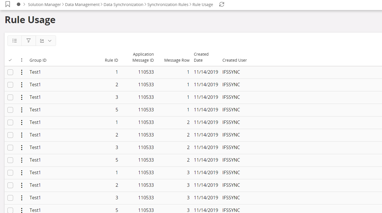 Rule usage shows the instances where the specific Synchronization Rule is used in the data replication. Rule Usage entries are made automatically once each rule is associated with an Application Message. Each rule usage shows the relevant Application Message ID and the Application message can be viewed through Application Message Viewer.