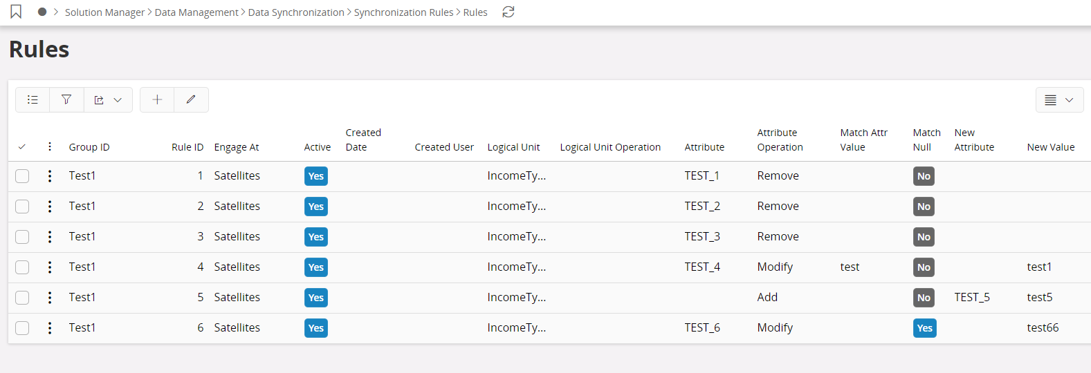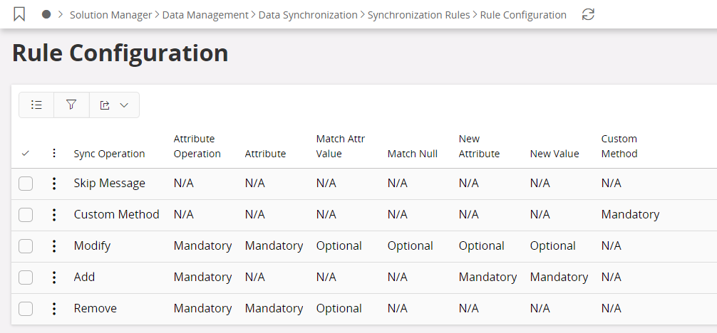 Synchronization Basic Data or the Rule Configuration defines the Logical Unit operations and Attributes operations. Each operation is defined elements which are mandatory, optional and not required. These definitions are checked against the rules that are created and violation will cause an error.
