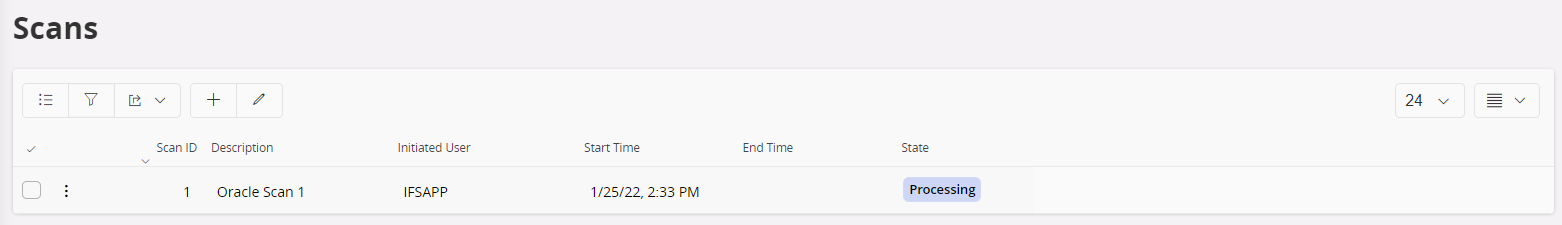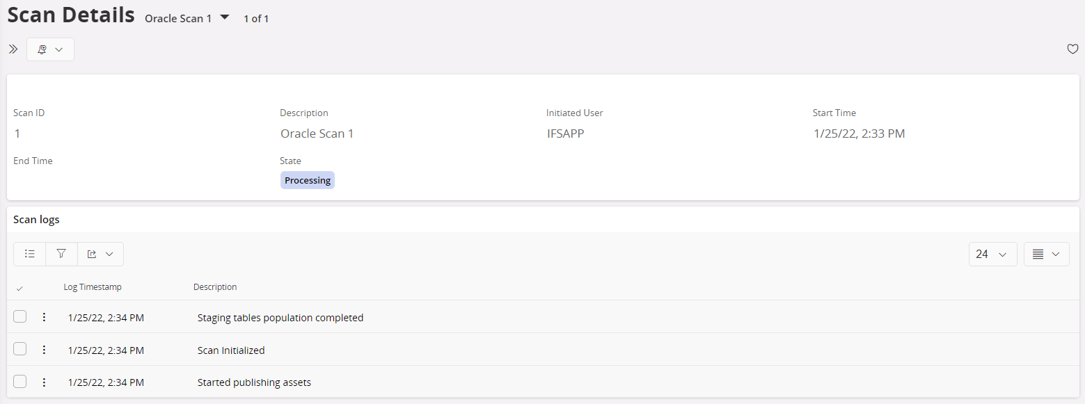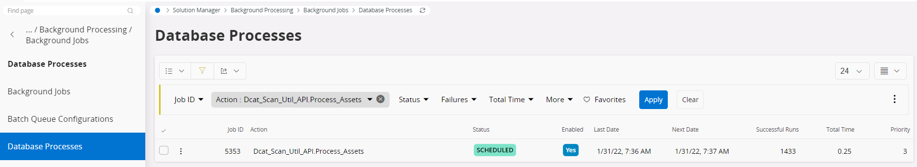 - 'IFS Data Catalog scan initialization' background job will enable the 'Dcat_Scan_Util_API.Process_Assets' database process.