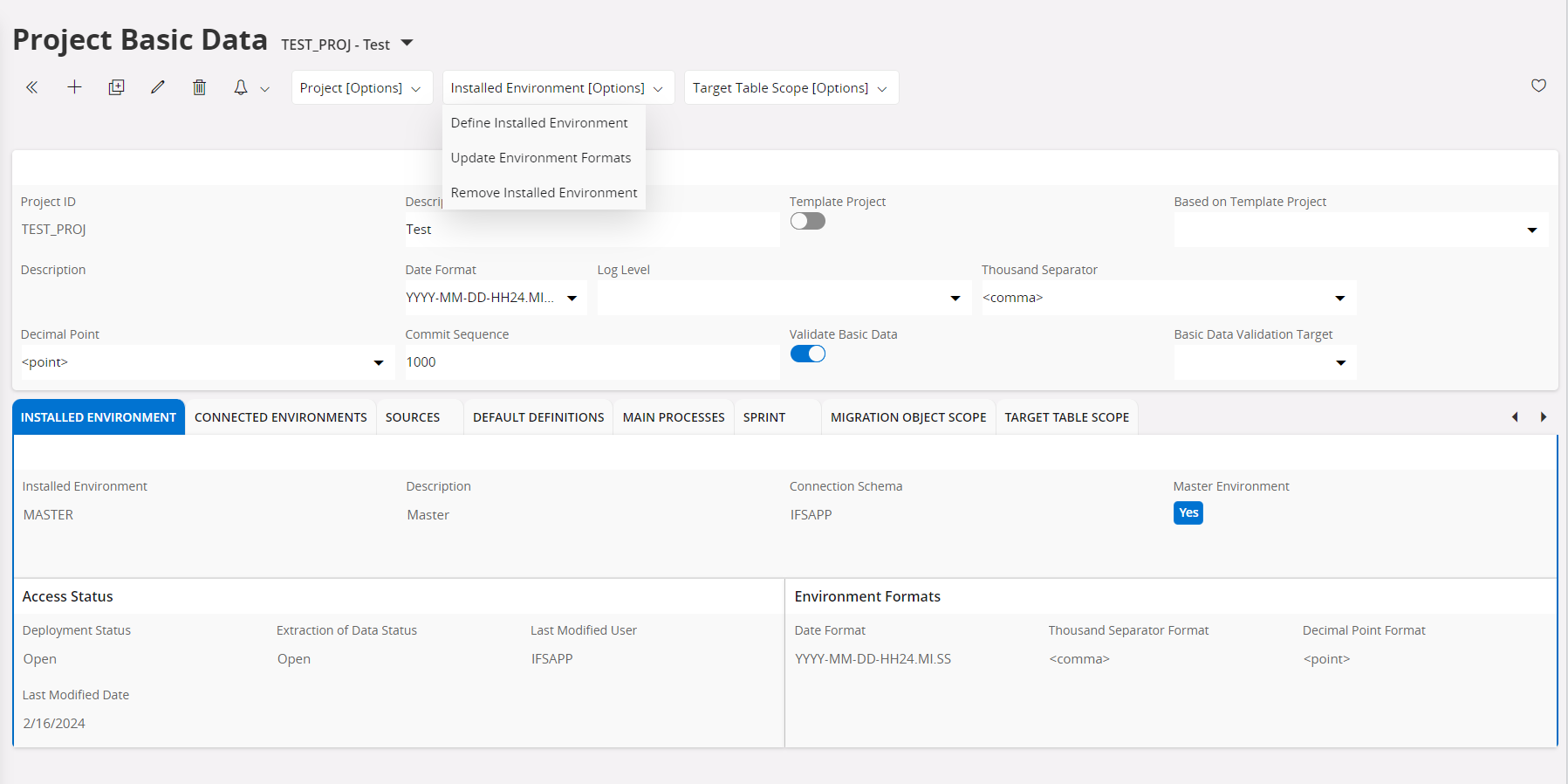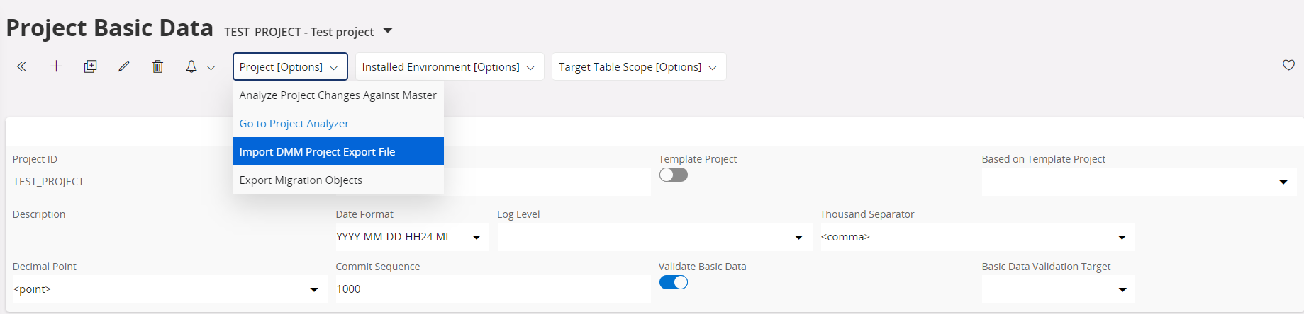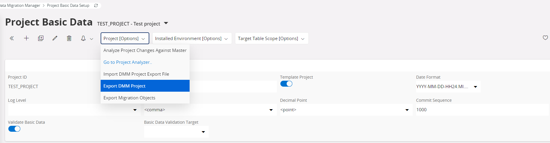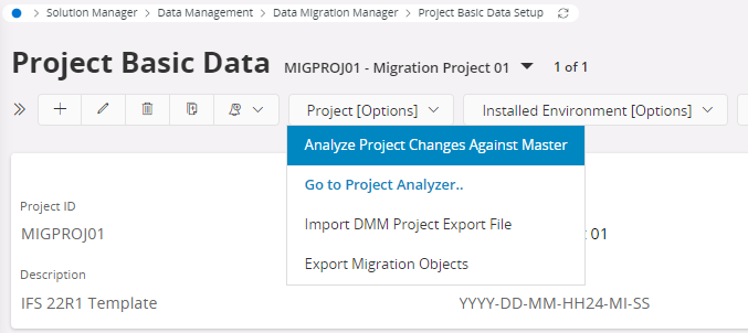 A project can be a customer or a template project or can be defined based on a template project. A Migration Project Header defines an ID and name for the migration project. It is also possible to define how the date, number formats should be displayed in the tool.