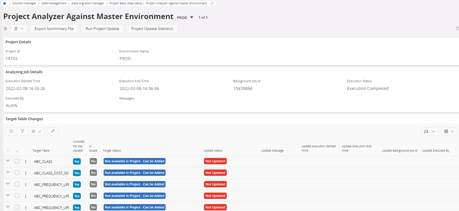 The Project Analyzer lists all Target Tables and their statuses regarding the Master Environment. From here the updates can be executed. To get a good overview it is possible to export a summary file or enter the Update Summary Screen.