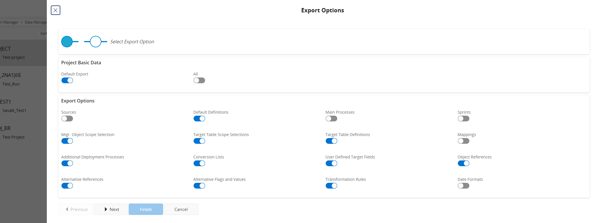 Users can either select default export options that are already enabled or user can enable all the additional options that are used within the scope of the project. Furthermore, the user can export one option at a time and the user will be notified if there are any dependencies between export options while selecting those options.