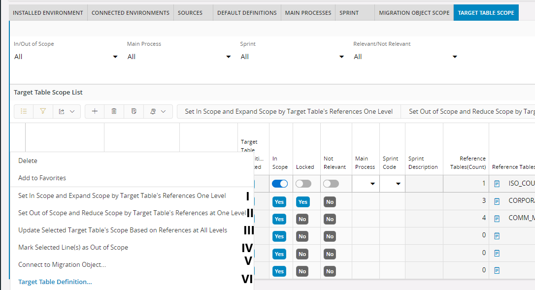The purpose of the Target Table Scope is to define what Target Tables should be handled in the Migration Project. There are 2 main ways to define the initial Target Table Scope. Generate it from the Migration Objects or define it manually. Once the initial Scope has been defined, it can be expanded by using the Referenced Tables Relationships. If a Target Table has a Reference Table in a field, this reference table can be automatically in Scope, and its Reference Tables too.