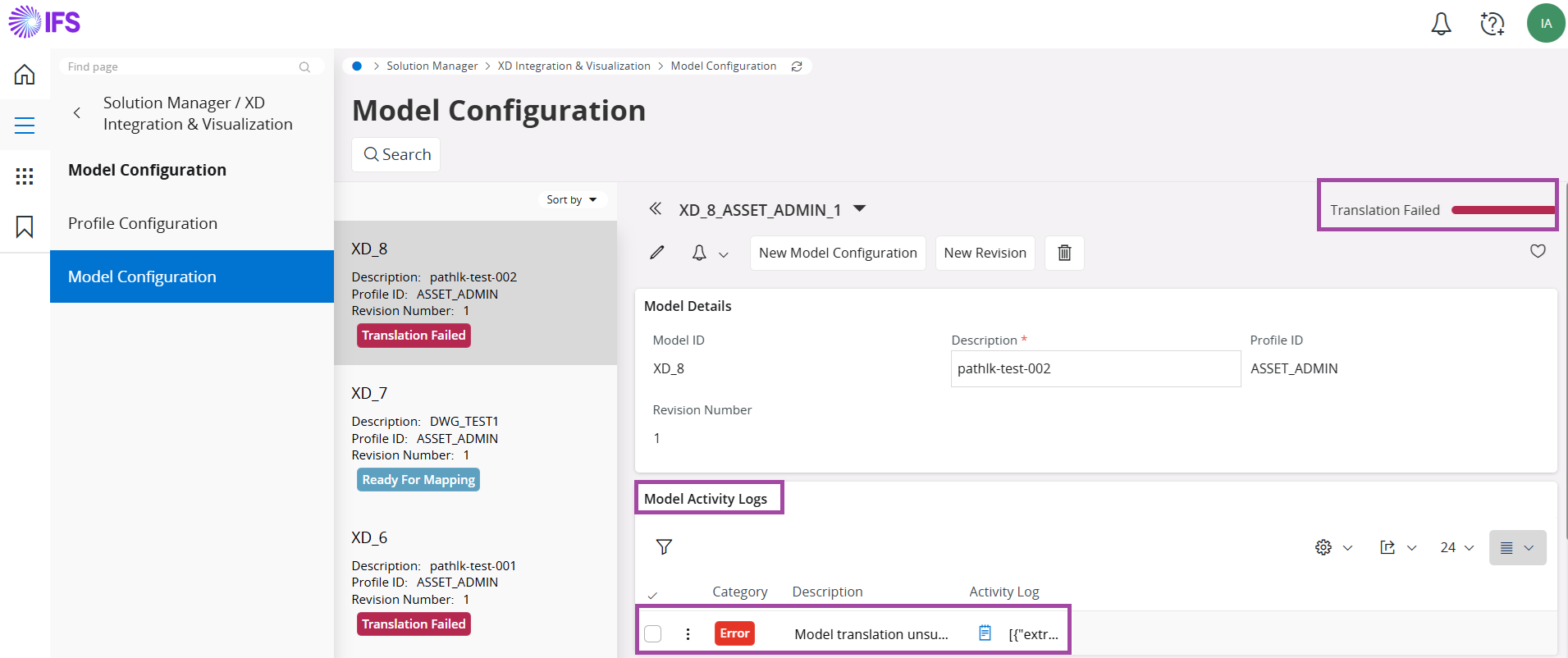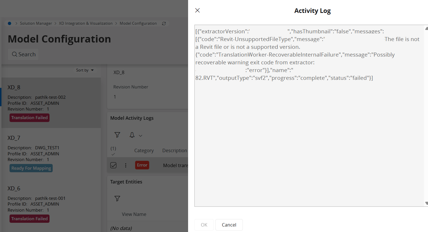 Note: If the translation process fails, a corresponding error message appears in the Model Activity Logs panel. Click on the file icon in the Activity Log column to view the detailed log.