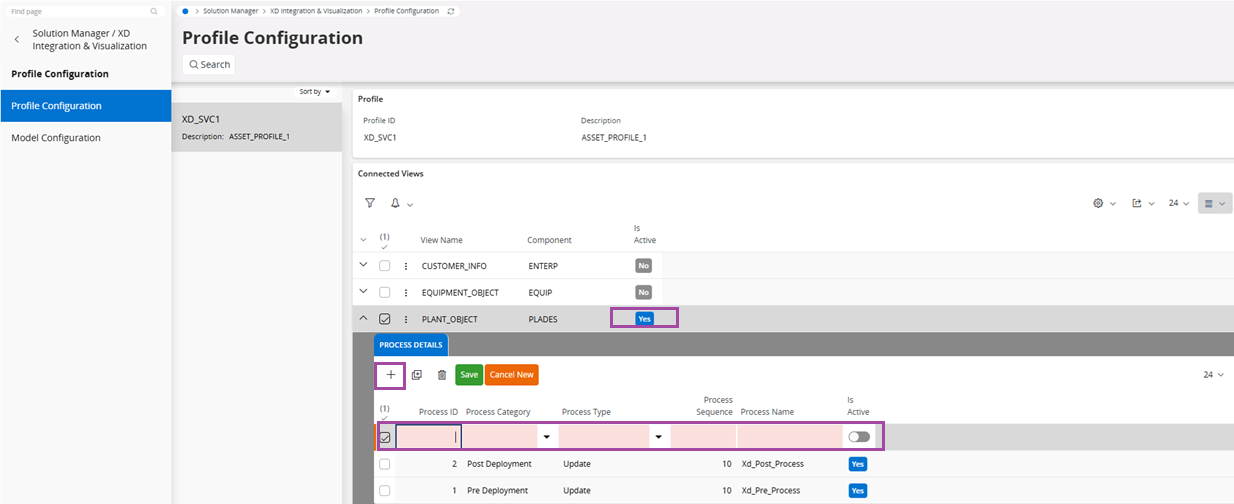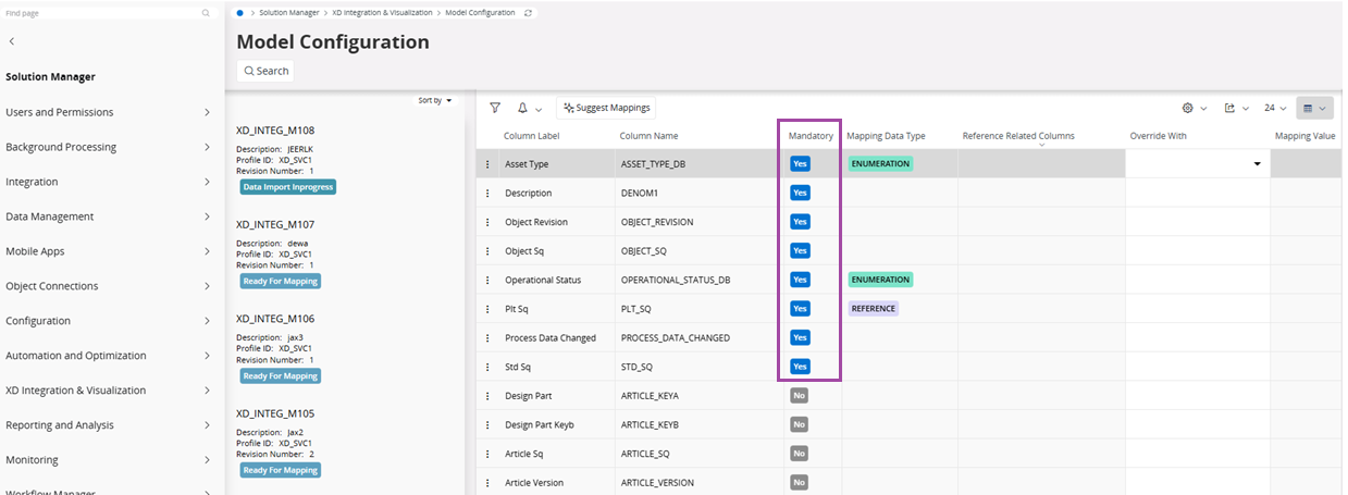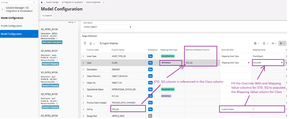 in the Override With column. This generates a dummy sequence in the import process. If the respective mapped column has a pre-deployment configured to fetch the actual value, it will be replaced with the actual value when data is imported. Otherwise, the generated dummy sequence is imported. The Connected Views can then be made active or inactive, and Process Details can be added and modified for each connected view from the Solution Manager > XD Integration and Visualization > Profile Configuration page.If you choose