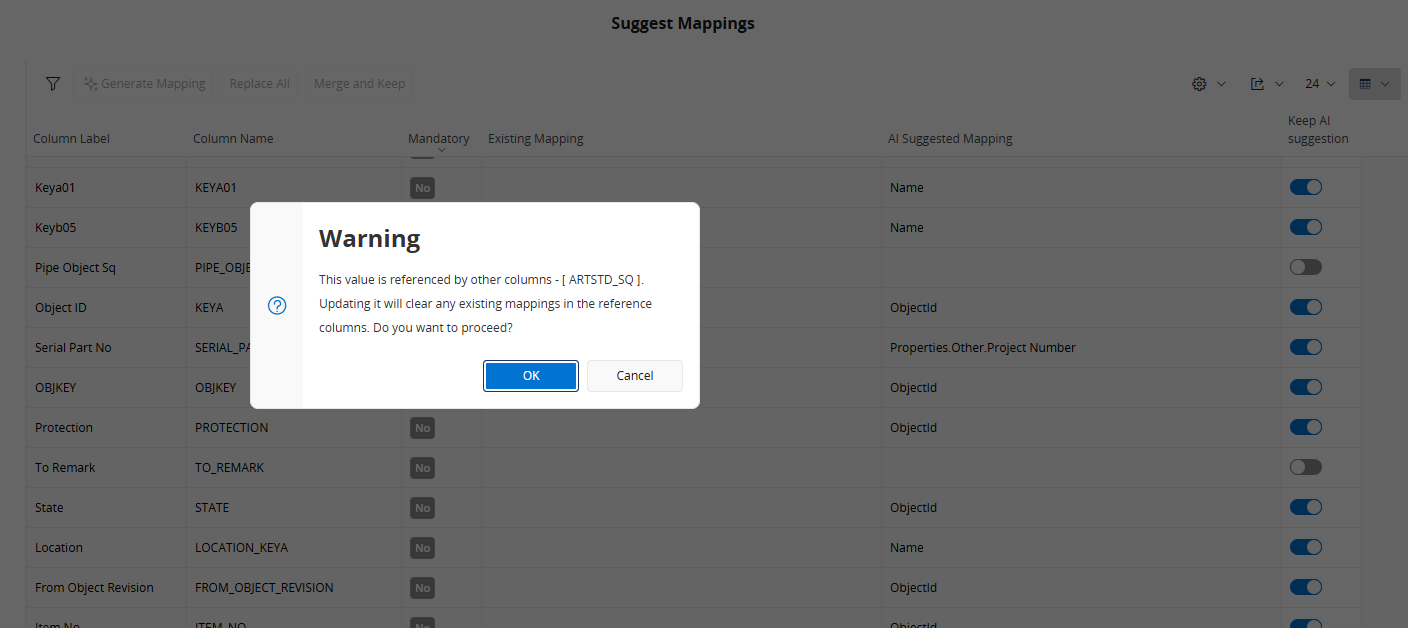 Note: While accepting AI mapping suggestions, if the AI suggestion replaces a value that is referenced in one or more columns, it throws a warning. Make sure that either the referenced values are retained or their references in the other columns are modified for a successful import.