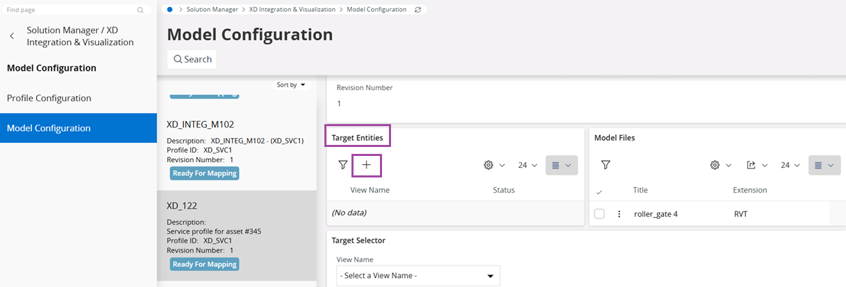 Add a target entity by clicking on the plus icon. The dropdown lists the view names that are active for the service profile you choose while adding a new model header.