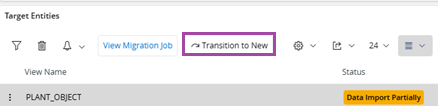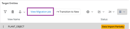 Note: For target entities, you can view their corresponding migration job by clicking on View Migration Job. You can also click Transition to New to bring the record back to the initial state and start the import process again.