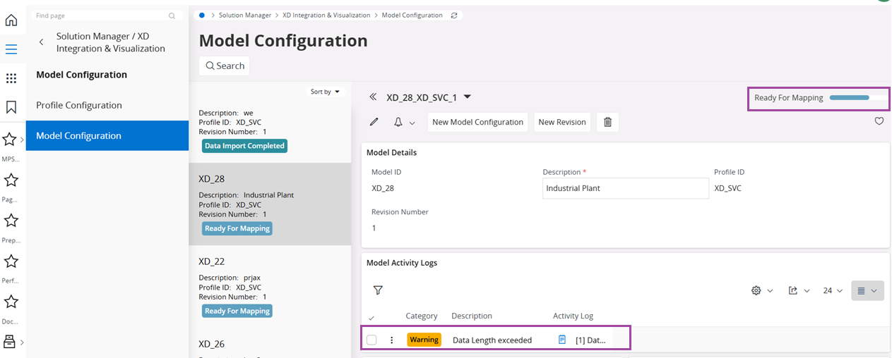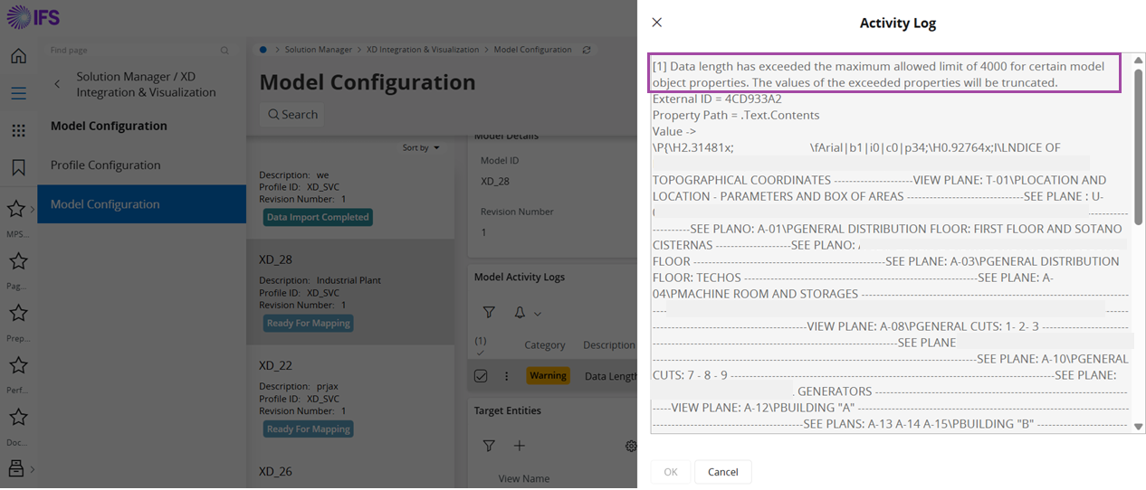 Note: The maximum data length allowed is 4000. If a property exceeds 4000 characters, a warning appears in the Model Activity Logs and the data beyond this limit will automatically be truncated. Click on the file icon in the Activity Log column to view the detailed log.