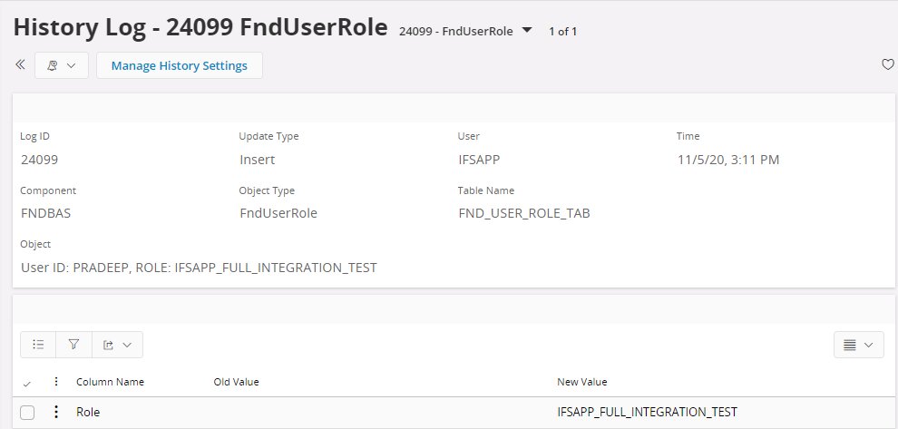 History type | Insert, Update or Delete |