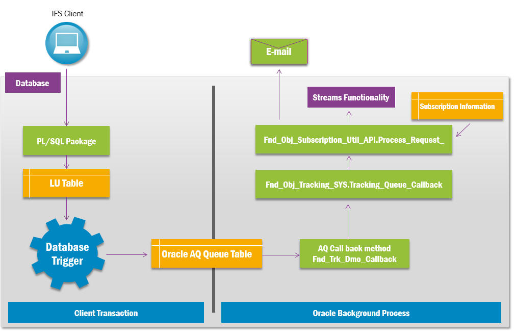 A PL/SQL procedure (Fnd_Trk_Dmo_Callback) is registered as a subscriber to this queue and when a message is queued Oracle internally runs scheduler jobs that would call this procedure. It would in turn call Fnd_Obj_Tracking_SYS.Tracking_Queue_Callback which then calls Fnd_Obj_Subscription_Util_API.Process_Request_ which does all subscription related processing. Then using subscription information, Stream messages and E-Mails are created to the users who have subscribed to the particular change. The Streams functionality also has a push notification services which informs connected clients if relevant streams are available.