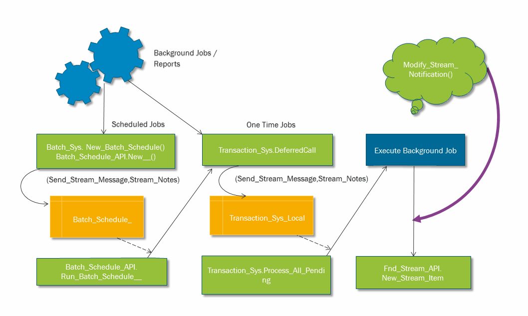Background jobs are typically of two types; One time background jobs (jobs posted through Transaction_SYS.Deferred_Call) and schedules (Posted through Batch_Sys. New_Batch_Schedule or Batch_Schedule_API.New__). The lifecycle these background jobs are controlled by the Transaction_SYS.Process_All_Pending scheduler job, which runs your background job and updates its completion state. This state information is used by the Streams for Background jobs runtime to notify the end user of job completion events (which could also be error state if the job encounters an error). This functionality is opt in for application developers. Additionally, one could customize the message which gets generated using one of the Modify API which "hooks" into the Streams for Background jobs. The procedure opting-in and using the hooking API is described in the following sections.