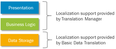 Naturally, the platform can not support the localization or translation of business logic in e.g. a Payroll application. However it can, and does, support the localization of the user interface, interface elements such as error messages in the business logic and some defined basic data in the data storage.
