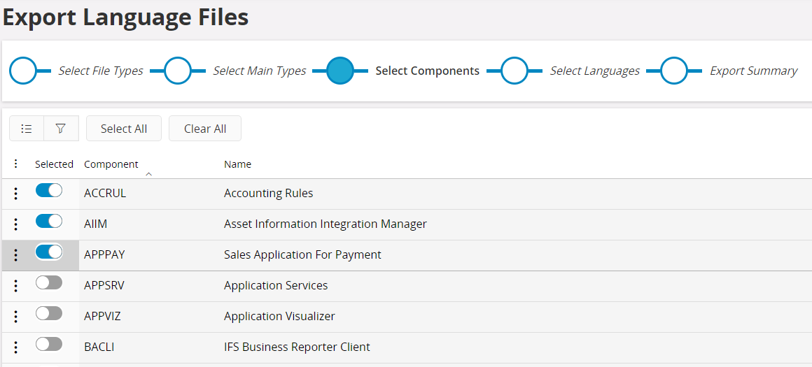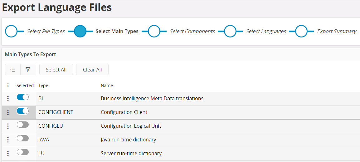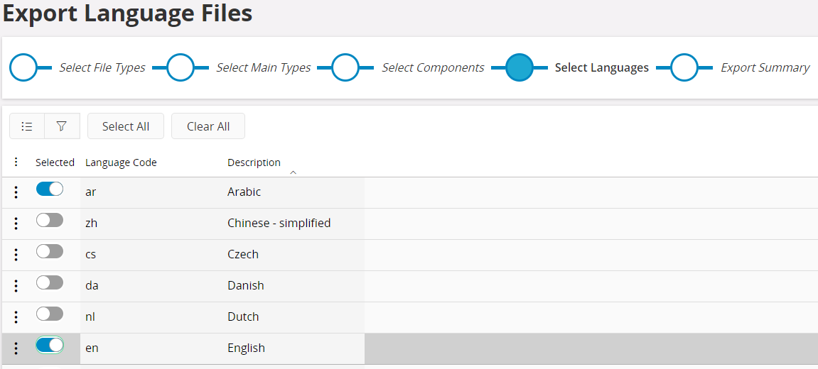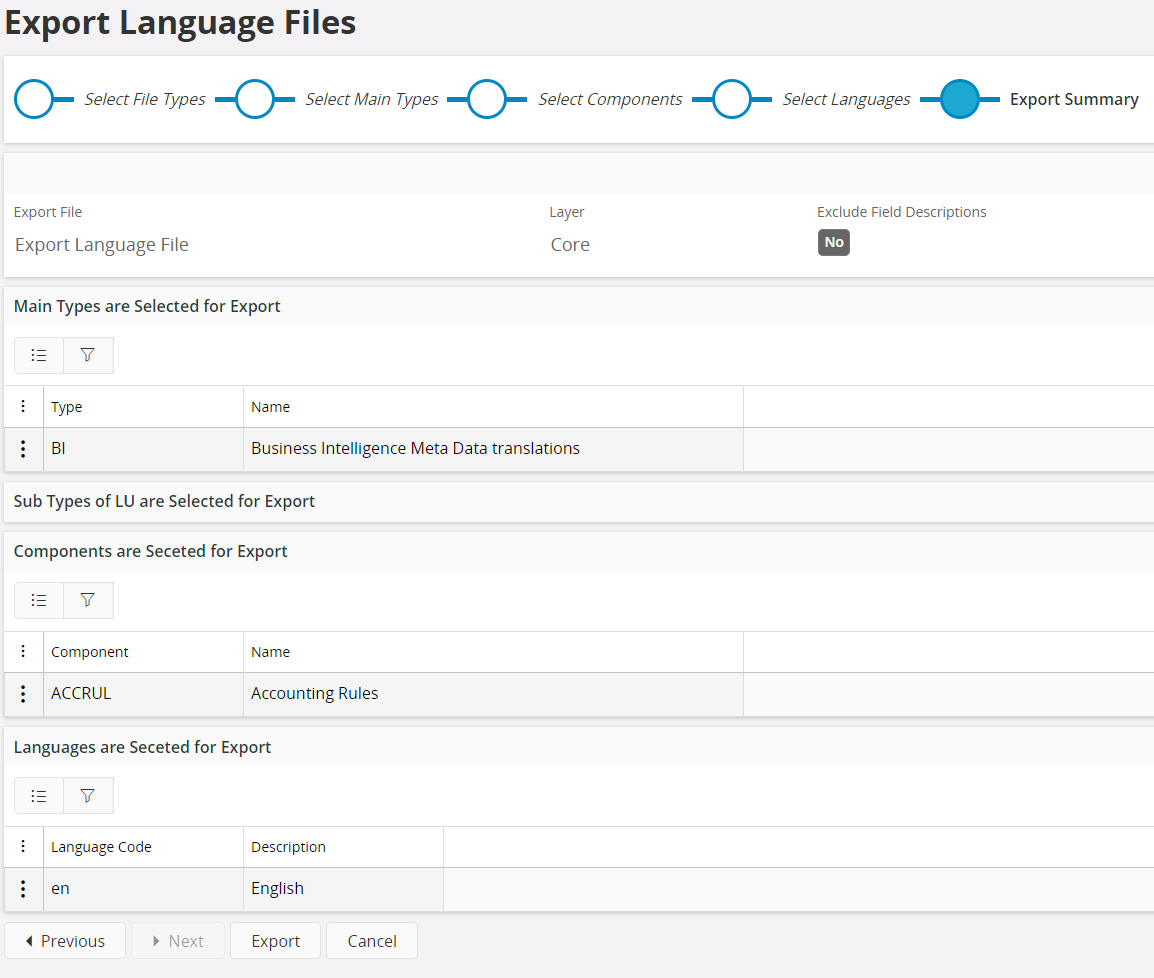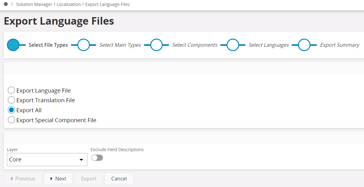 In order to export Language Files, Translation Files and Special Components Files, select Export All. This will export both language and translation files for selected Main Types, components and languages.