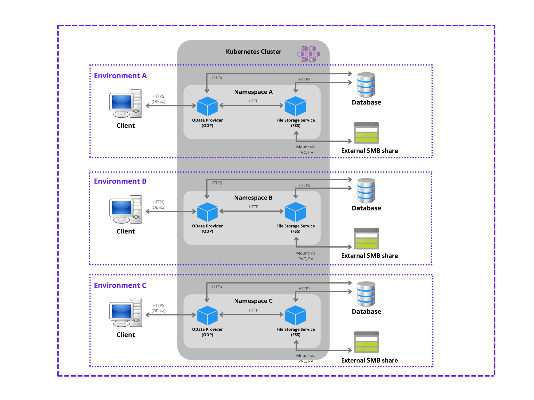 In the remote deployment model, the File Storage uses a SMB (Server Message Block) share to store files. A SMB share is required per environment. Before installing the middle tier, it's important to configure the share first. This involves setting up the share with the appropriate permissions, security settings, and access controls to ensure that it's accessible and secure for all intended users. Follow Cloud File Storage for Remote for more information.