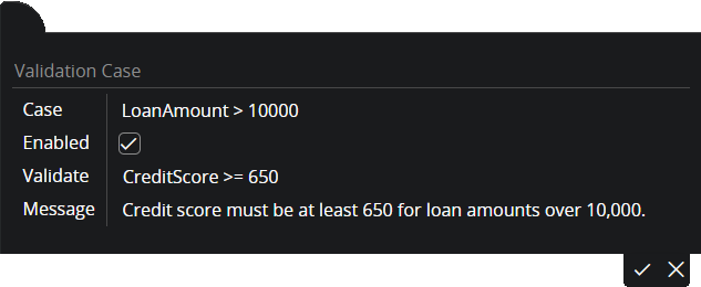Enabled | A static flag used to activate or deactivate a validation case item manually. This attribute allows administrators to temporarily disable specific validations without altering or deleting them. It facilitates easier management and merging of validation configurations during updates. |