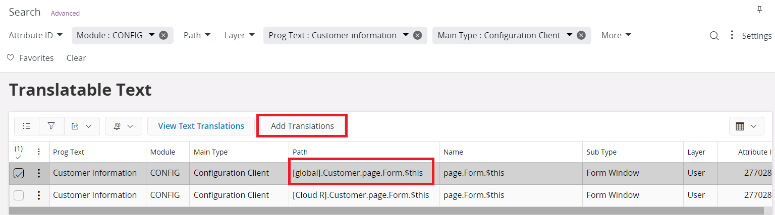 The simplest way to find the translatable items for your configuration is to navigate from the 'Page Configuration' page. Select the 'Client Model' for which you want to filter 'Translatable Items', then choose 'View Translatable Items' from the 'Translations' menu. This will open the 'Translatable Text' page and filter out the configuration translatable items for the selected client model.