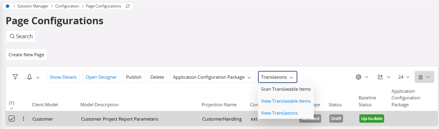 Then the found translatable items can be translated into different languages. Client configurations—such as page configurations and connected navigator items—are scanned from the Page Configurations administrative page.
