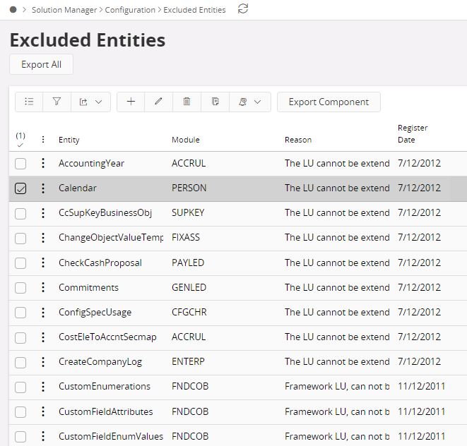 The command Export Component lets you export all the Entities which belong to a certain Component that you need to avoid extending in configuration layer. The file can be used to run during installation of IFS Cloud in order to avoid configuration items on certain Entities.
