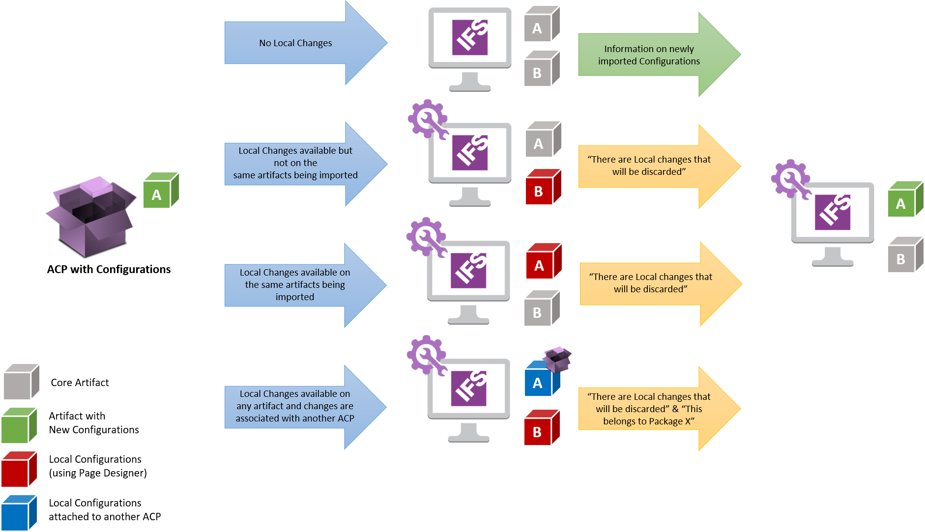 Below Diagram explains how the Client Model will be replaced on different states in the target environment with Local Configurations and Configurations attached to another ACP. (A and B are two artifacts available in the target environment in the same Client Model and a Configuration to artifact A will be imported with an ACP)