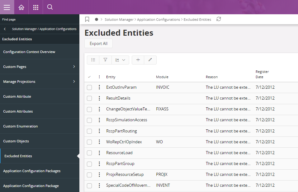 The Excluded Entities page lists the manually registered Entities that cannot be extended due to architectural reasons. Reasons for this can be including, but not limited to:
