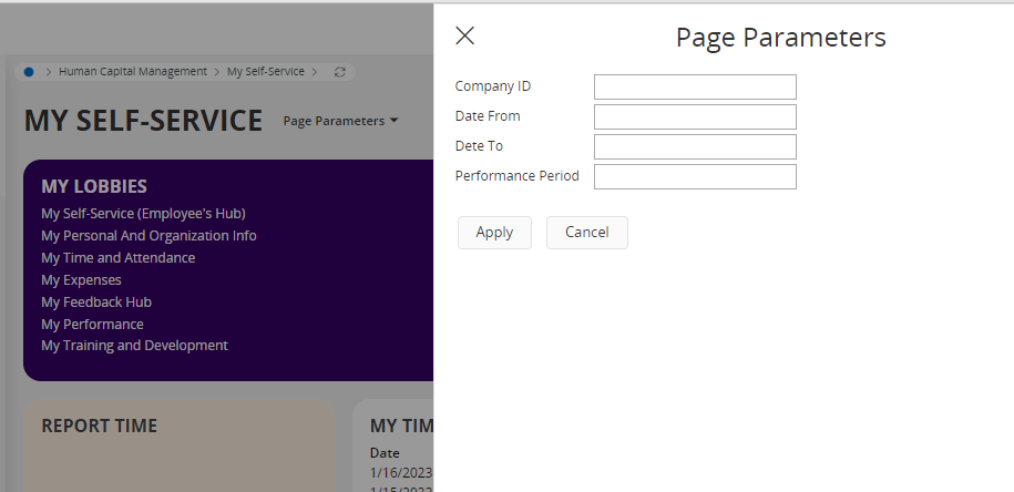 Page parameters are used to configure data visualization within lobby elements. Admin users have the ability to set up page parameters at the Data Source level. Once configured, these parameters are displayed as input fields within the Page Parameter slide-out menu.