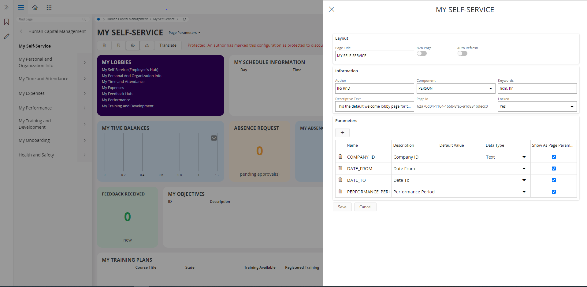 - Information: In this section you can see/modify the author of the page, define key words to make it easier to find the page in the Lobby Overview and write a text with additional information about the page. In addition you can see if the page is copied from another page. There is a link for the presentation object created for the page. Navigate to the following page Solution Manager/Security/Permission Sets/Presentation Object Grants where you can define the security settings for the page. Read more in Installation and Security. Once you have completed your configuration of a page use the Locked dropdown to protect the configuration from changes. If a page is locked for changes a warning is displayed in the header of the configuration dialog. In this warning there is a button , Edit Anyway, which you can use to continue to make configurations.