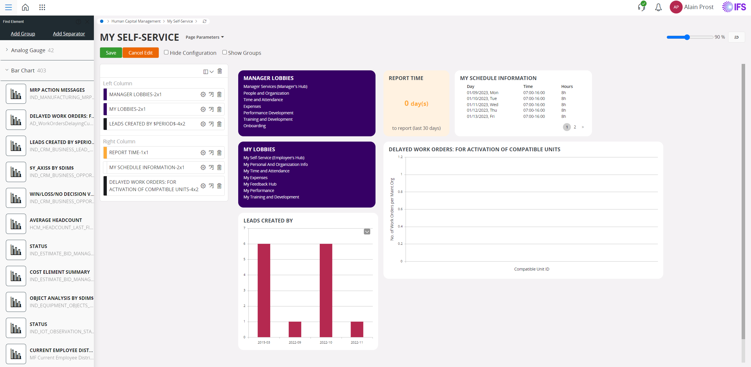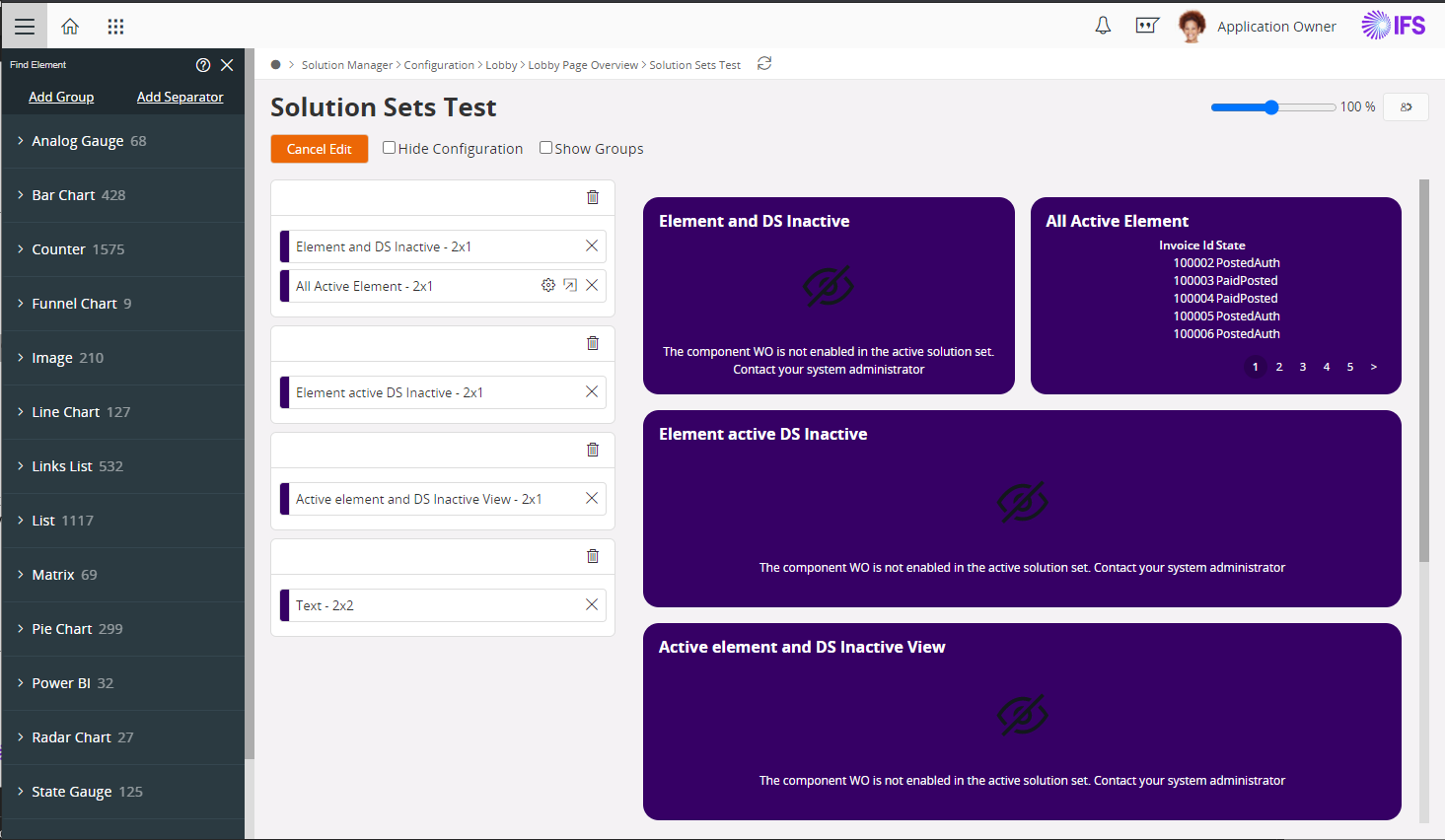 Installing IFS Cloud includes all technical components but only a subset of them are considered as active and able to use. This concept is called Solution Sets. We introduced an indication in lobby page designer mode to inform the user of the unavailability of lobby elements if inactive components are present.