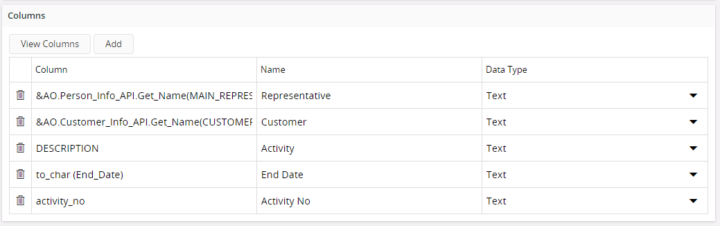 This section is used to manage which columns to use from the view. You can add columns, remove columns and re-arrange the order of the columns.