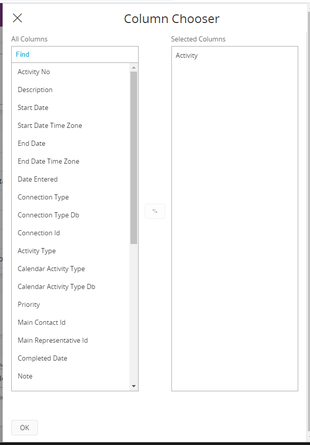 - Click View Columns button which opens the column chooser dialog. All available columns in the view are displayed in the left side of the dialog, select a column and click on the swap button in the middle to add it.