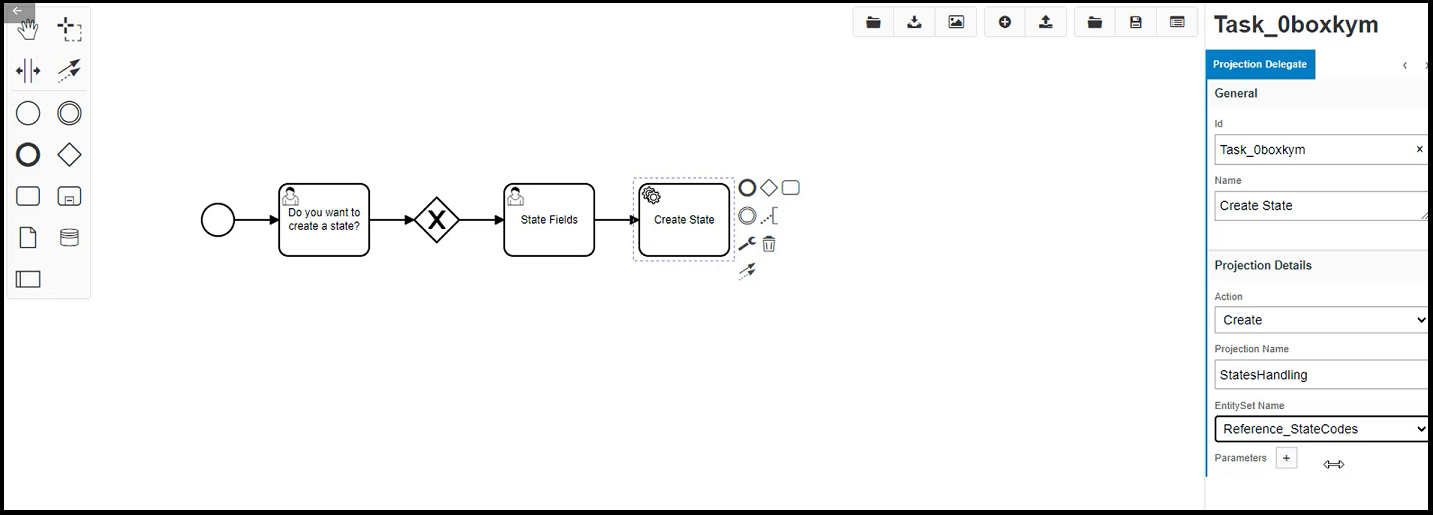 Calling a projection is one of the most common steps that is required to alter data via creating, updating, deleting etc. This can be seen in the following screenshot where the user has clicked on the Create State task, in the Properties Panel section of the Workflow Designer of that task allows the user to select which action, projection and entity set to call along with passing output parameters such as projection fields to the projection to update that field within the projection accordingly.