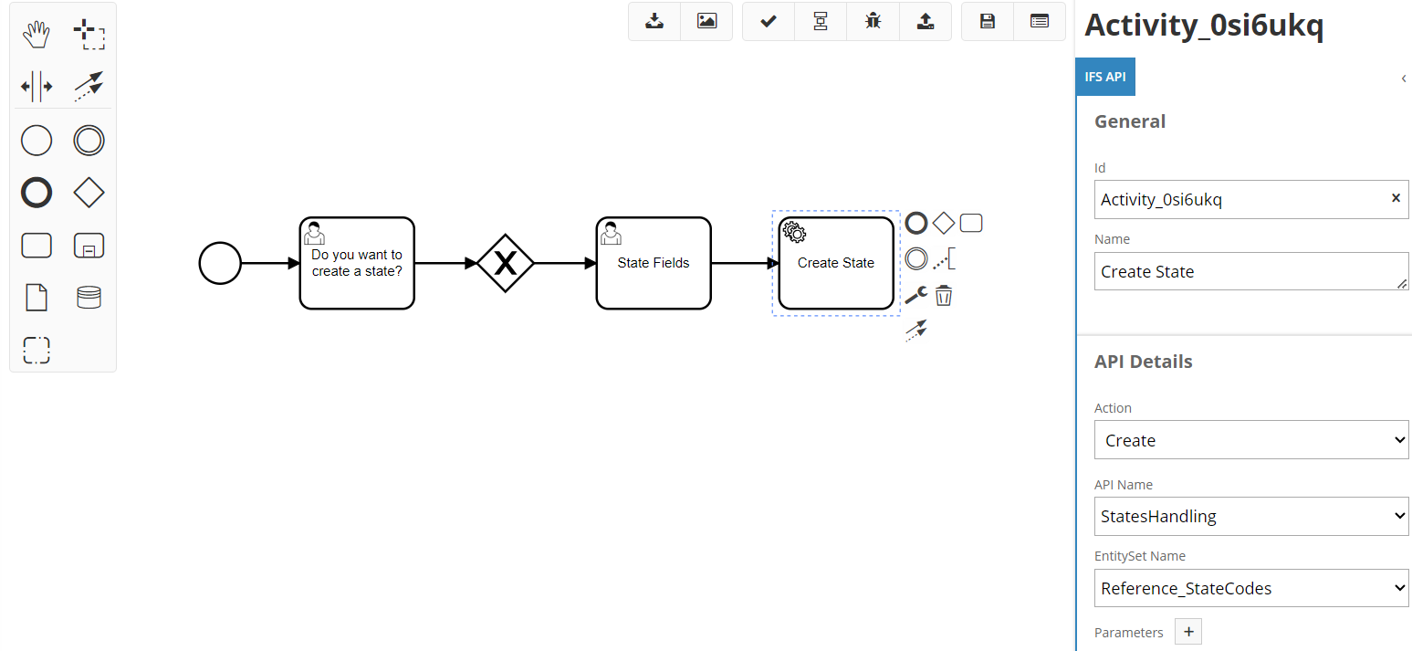 The IFS API Task would be selected, and the user needs to choose the relevant Action, API Name and Entity Set Name. The IFS API task doesn't always have to be straight after a user task. In this scenario, the user enters the information and that information is used to create the State record.
